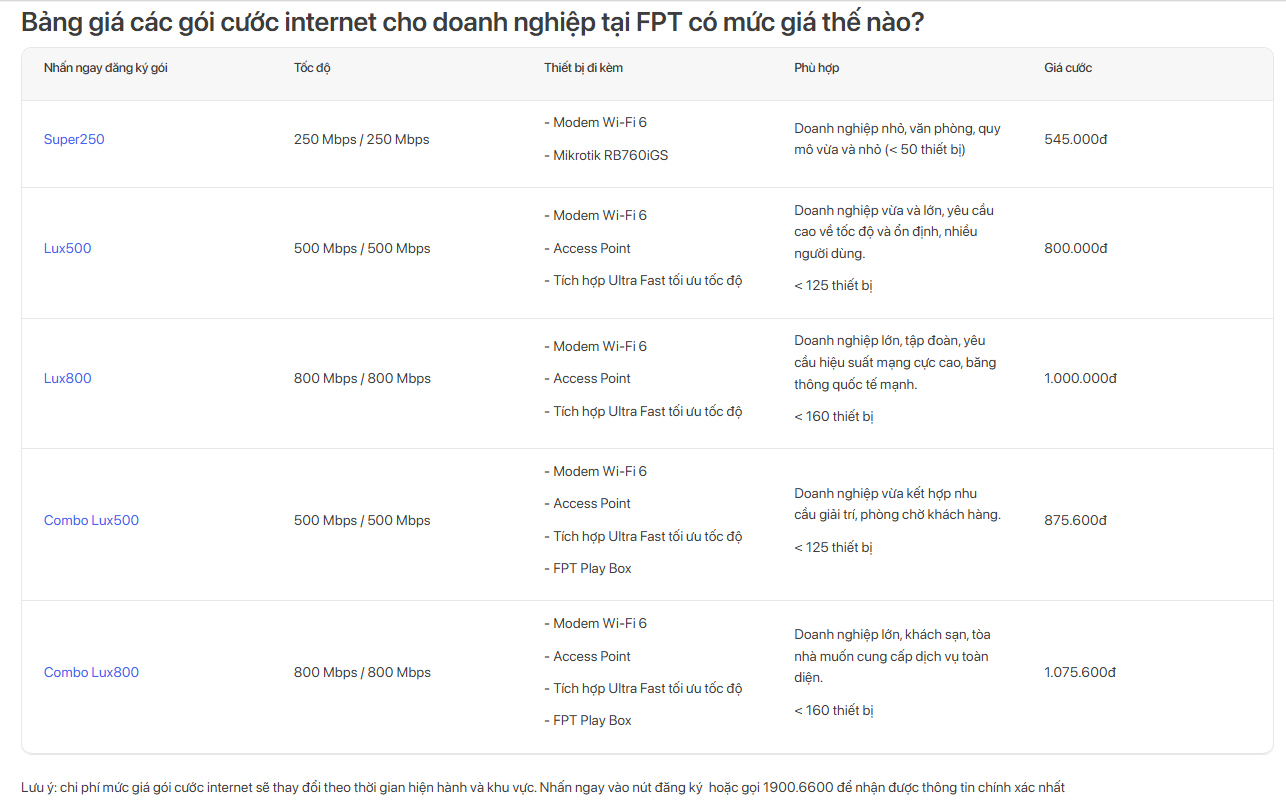 Trong năm 2025, FPT Telecom đặt mục tiêu mang đến cho doanh nghiệp và công ty trải nghiệm Internet mượt mà hơn, hỗ trợ tối đa cho công việc, sản xuất kinh doanh và vận hành hệ thống. Với chi phí lắp đặt gói cước internet FPT Doanh Nghiệp hợp lý, nhà mạng FPT triển khai nhiều gói cước cáp quang phù hợp, đáp ứng nhu cầu từ cơ bản đến nâng cao. Dưới đây là những gói dịch vụ nổi bật mà FPT đang cung cấp để khách hàng dễ dàng lựa chọn theo nhu cầu thực tế.